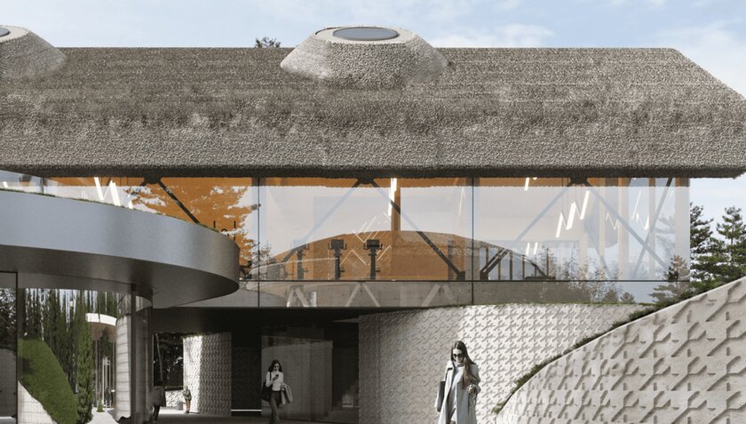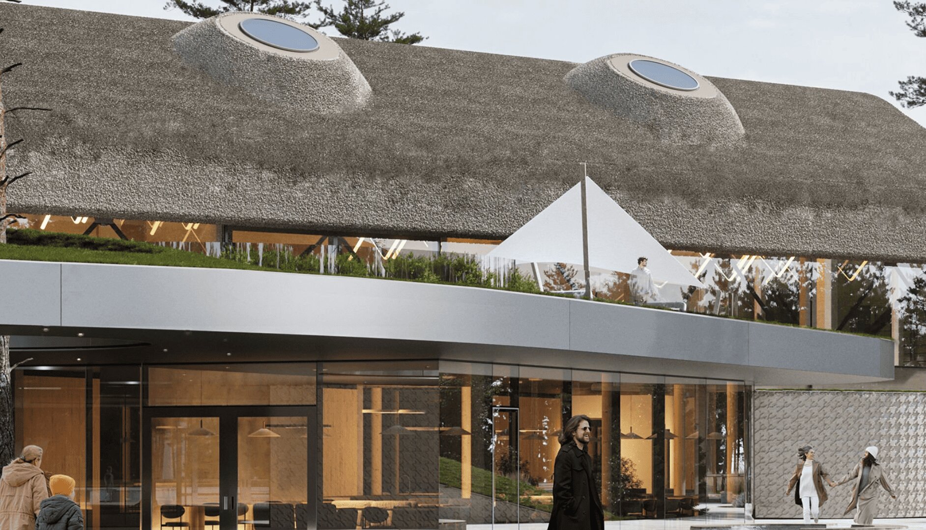 Недалеко от Москвы находится посёлок премиум-класса Straw Hill. Его въездная группа выполнена в форме древнерусской избы, а архитектурные элементы делают отсылку к славянскому зодчеству. С помощью геопластики первый этаж объединился с ландшафтом. А на кровле можно заниматься спортом.