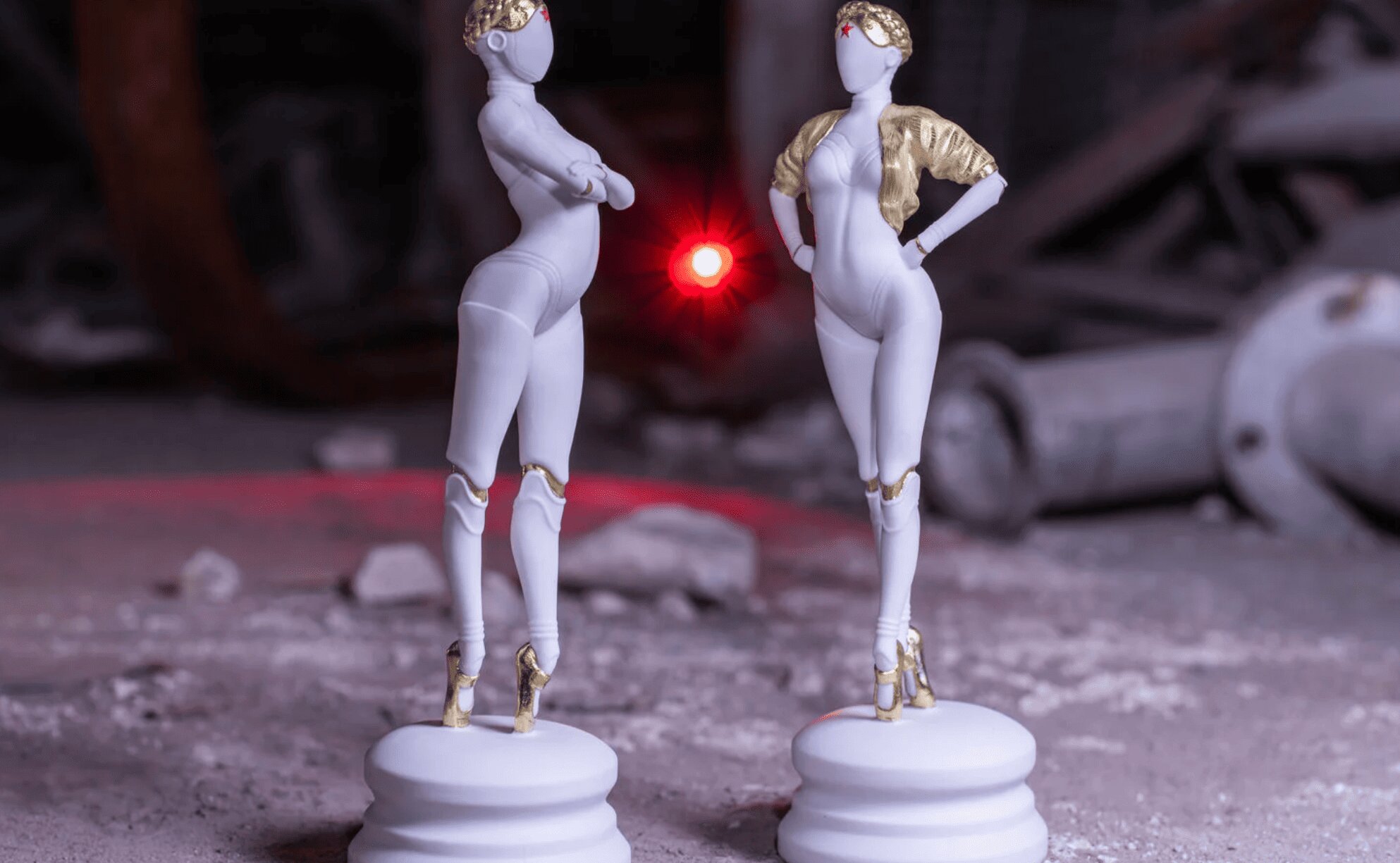 Модельки Близняшек покрыты позолотой 52-й пробы, их вручную обработали агатовым карандашом, чтобы добиться зеркального сияния. Габариты и вес фигурок не уточняются. Тираж лимитирован, каждая статуэтка имеет свой номер и защиту в виде стикера-пломбы. На первом бокале изображён агент Сергей Нечаев с молотом на плече. На втором — роботы-балерины Близняшки.