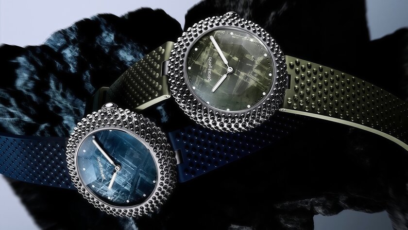 Диаметр моделей увеличился с 36,5 мм до 41 мм. Их выпуклый корпус выполнен из титана Grade-5 и украшен 234 бусинами из белого золота. Сбоку расположена заводная головка из того же золота с полированным кабошоном. Задняя крышка часов сделана из сапфирового стекла, через которое виден механизм. Дизайн циферблатов отсылает к метеоритам и дополняется динамичной текстурой, которая создает иллюзию игры света и тени.