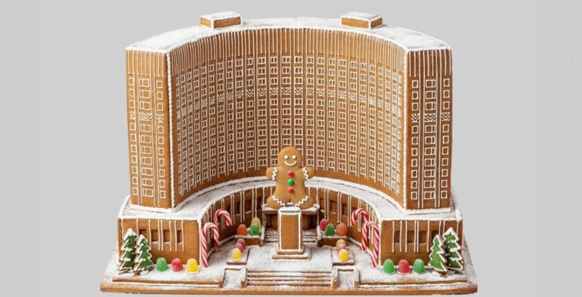 У всех этих объектов пряничная текстура, панели из сахара и окна из глазури. Вместо людей — мармеладные снеговики и имбирные пряники. Здания украшены леденцами, конфетами и сладкими ёлками.