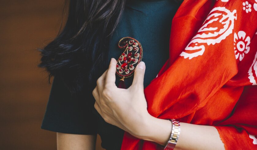 - Брошь. Если наряд тусклый или простой, то можно «разбавить» его ярким акцентом, например, брошью в виде огромного цветка. Это придаст образу завершённости и сделает его более заметным.