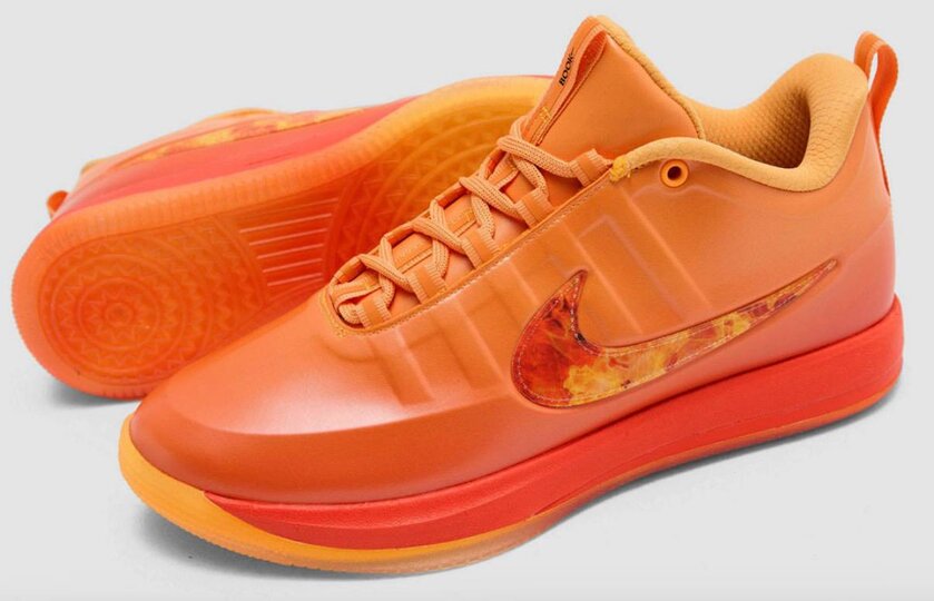 У Book 2 скульптурный формованный верх в градиенте оранжевого цвета заката. Центральный элемент модели - логотип Swoosh, переосмысленный с помощью линзовидного брендинга и меняющихся графических изображений пламени в зависимости от движения. Подошва выполнена в виде радиального рисунка солнца и является завершающим штрихом всего внешнего вида кроссовок.