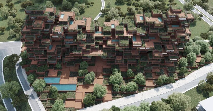 Архитектурное бюро Georges Batzios Architects спроектировало Red Hills, жилую башню в районе Аттика. Она тянется вверх на 14 этажей, состоящих из расположенных друг над другом объемов терракотового оттенка.