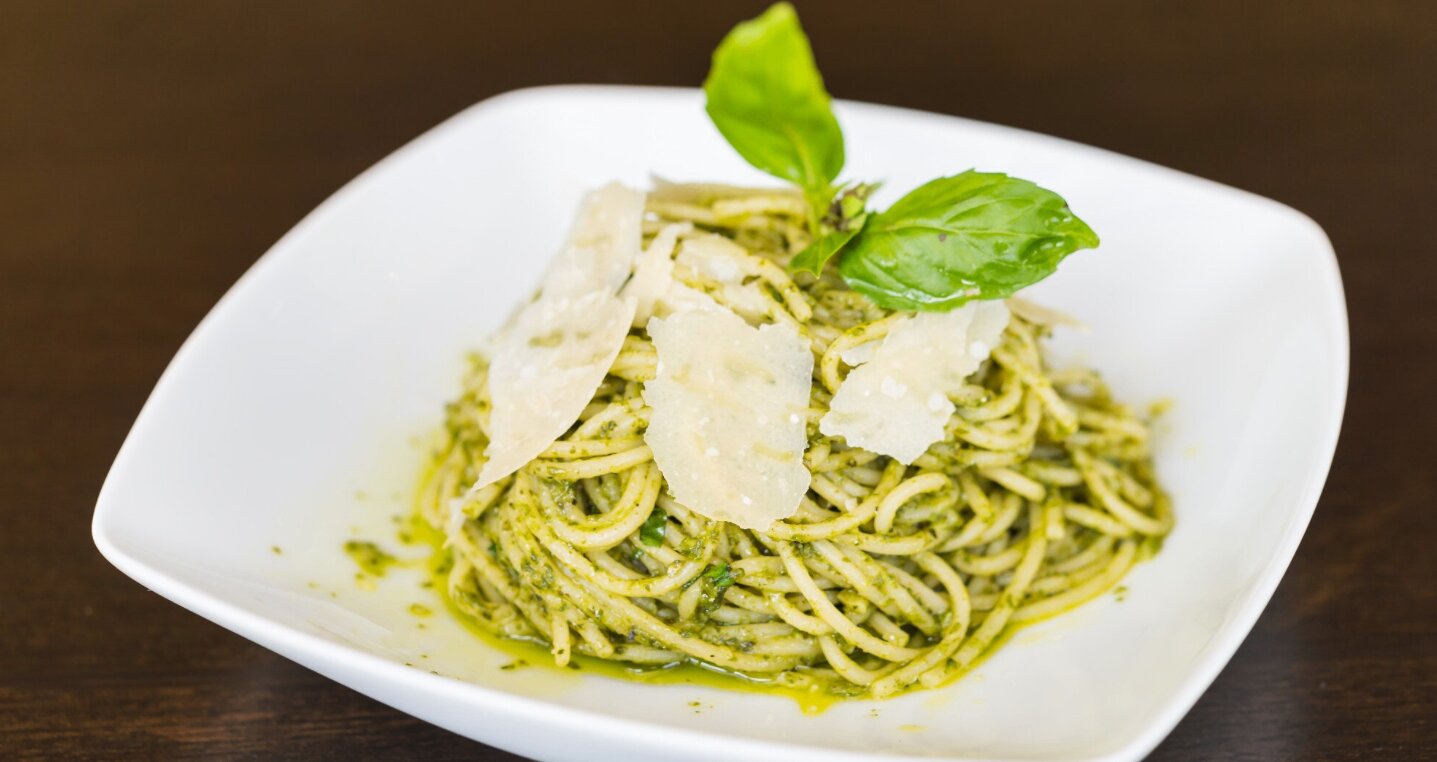 Лук нужно нарезать мелким кубиком. Измельчить чеснок. Помидорки разделить на половинки, а филе нарезать тонкими слайсами. Также нужно мелко порубить петрушку. Затем необходимо наполнить кастрюлю водой, подсолить и поставить на плиту. После того, как она закипит, всыпать спагетти и варить около 6-8 минут. На сковороде разогреть масло и обжарить на нём лук и чеснок. Добавить к ним филе, обжаривать ещё 3 минуты. Затем добавить помидоры, песто и петрушку. Перемешать. Убавить огонь и залить всё сливками. Посолить, поперчить и готовить до момента, когда сливки загустеют. Готовые спагетти нужно откинуть на дуршлаг, а когда с них сойдёт лишняя жидкость, добавить к мясу. При подаче можно потереть на блюдо сыр.