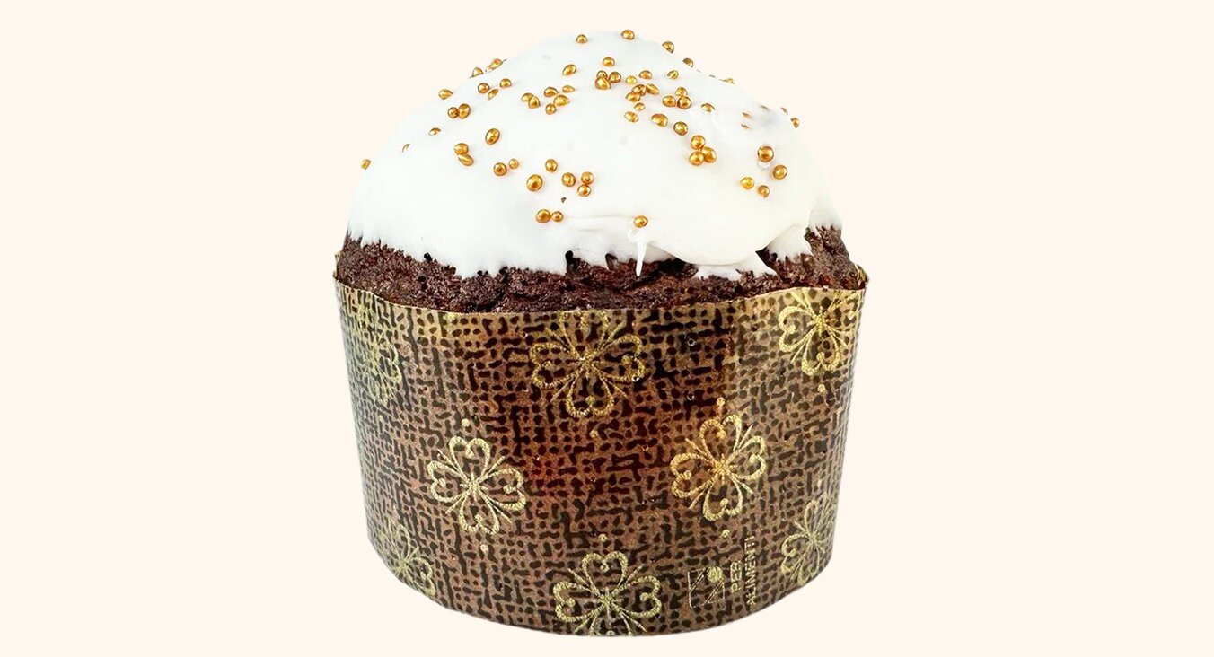 Шоколадный кулич с добавлением дроблёных грецких орехов. Сверху покрыт белой глазурью и съедобными золотыми шариками. Масса — 100 грамм, срок годности — 21 сутки. Купить его можно в «Лавке».