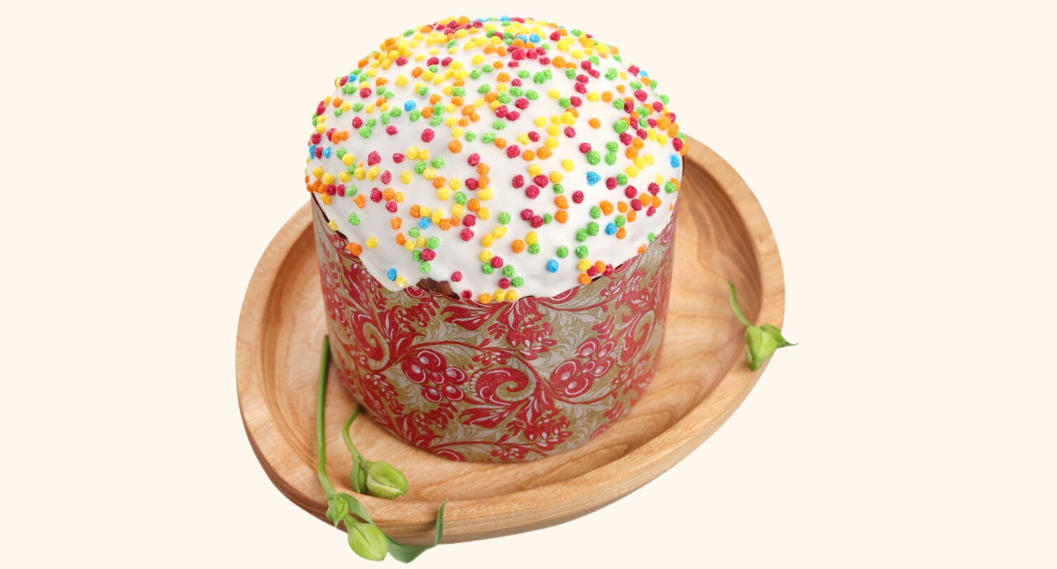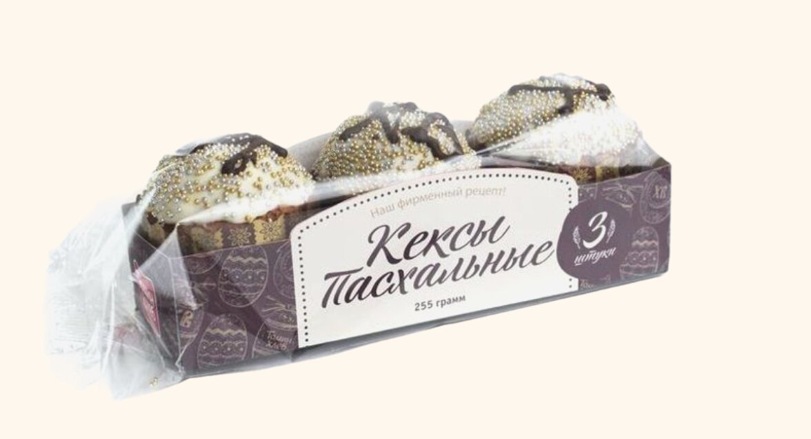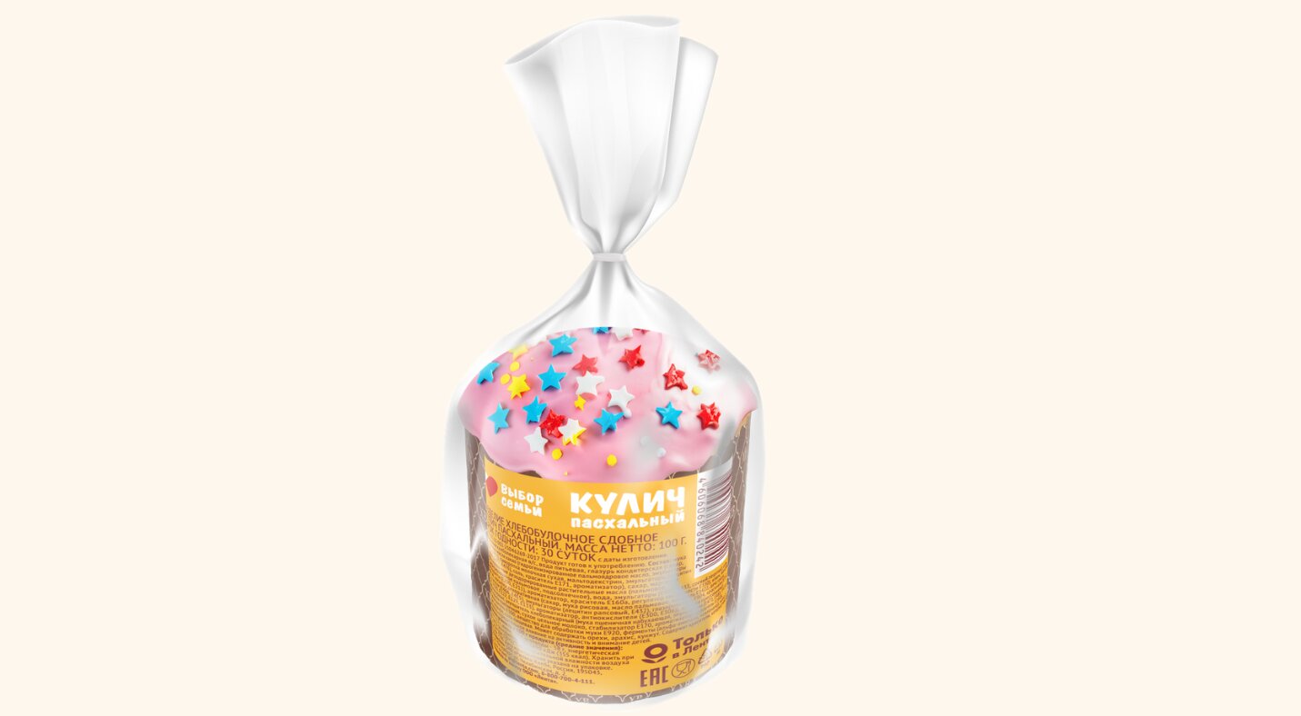 Небольшой кулич, созданный на основе подсолнечного масла и майонеза. Внутри есть изюм, верхушку покрывает белая глазурь с добавлением цветного воздушного риса. Масса — 250 грамм, найти можно в сети «Лента».