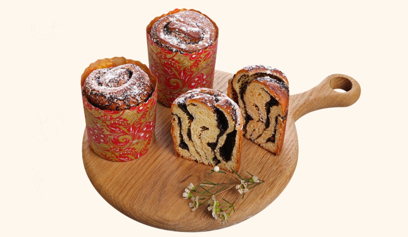 Кулич-краффин из сдобного теста со сладкой маковой начинкой. Сверху присыпан сахарной пудрой. Масса — 110 грамм. Приобрести можно в магазинах сети «Лента».