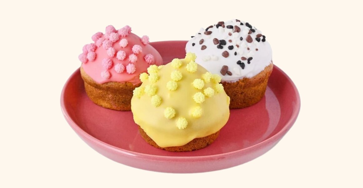 Это набор из трёх небольших творожных кексов. Один из них пустой, в другом начинка из вишни, а в третьем — из манго. Сверху кексы украшены разноцветной глазурью и посыпкой. Масса набора — 200 грамм. Срок годности — 7 дней. Приобрести можно в сети «Перекрёсток».