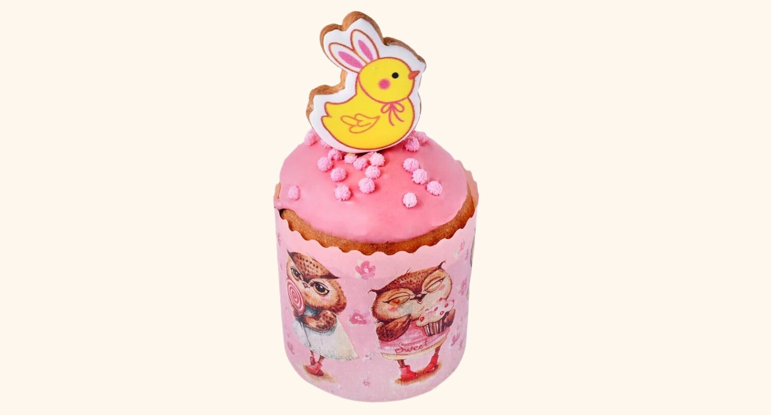 Традиционный кулич, но внутри вместо изюма находятся кусочки шоколада. Из декора — розовая глазурь, розовая кондитерская посыпка и печенье на палочке в виде цыплёнка с ушками кролика. Масса — 250 грамм. Срок годности — 7 дней. Найти можно в сети «Перекрёсток».