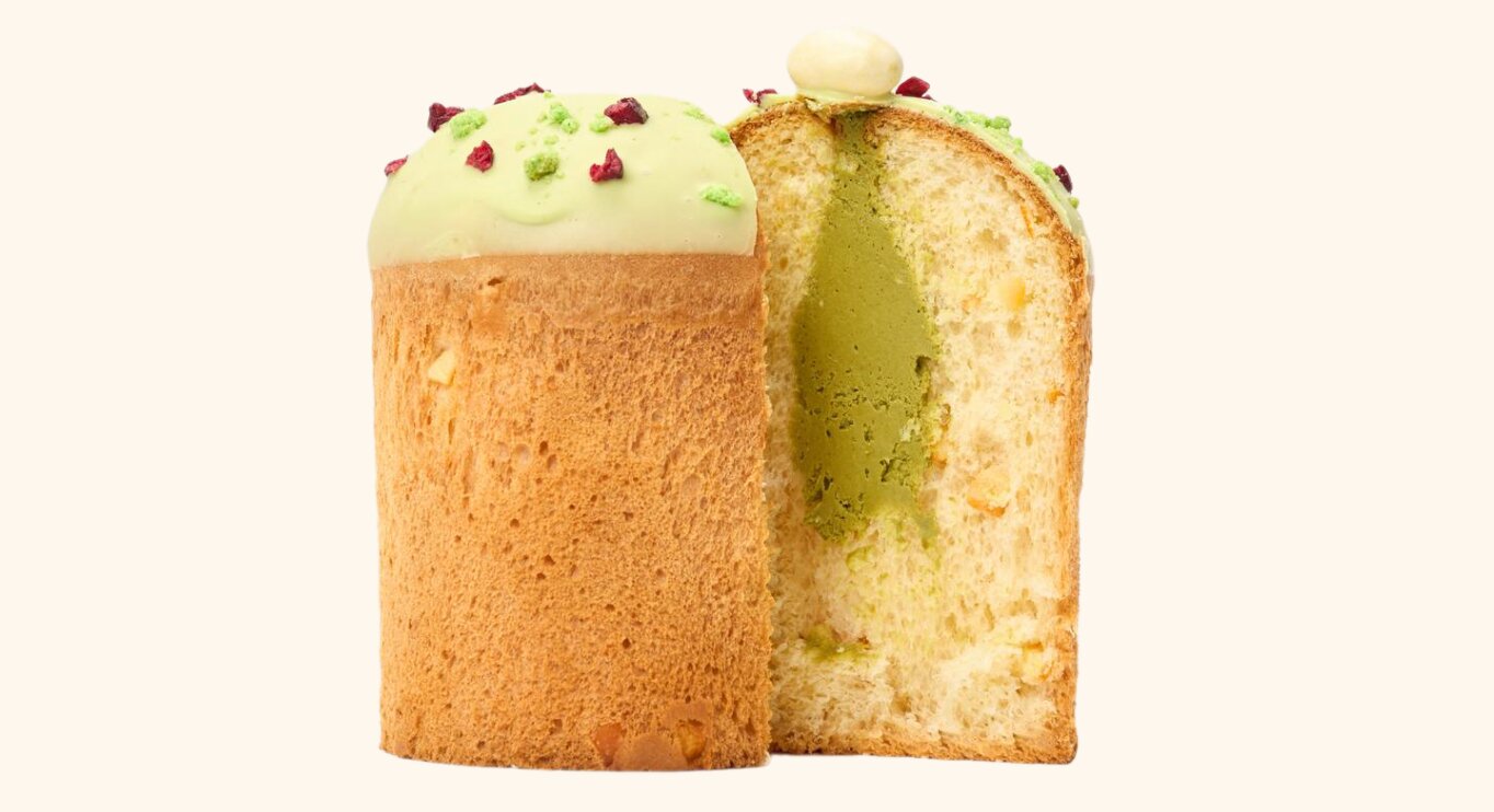 Пасхальный кулич из сдобного теста. Начинка сделана из ванильно-сливочного крема и обжаренных фисташек. Украшен кулич глазурью из белого шоколада, драже из миндаля, сублимированной вишней и песочной крошкой. Его масса — 250 грамм. Приобрести можно в сервисе «Самокат».