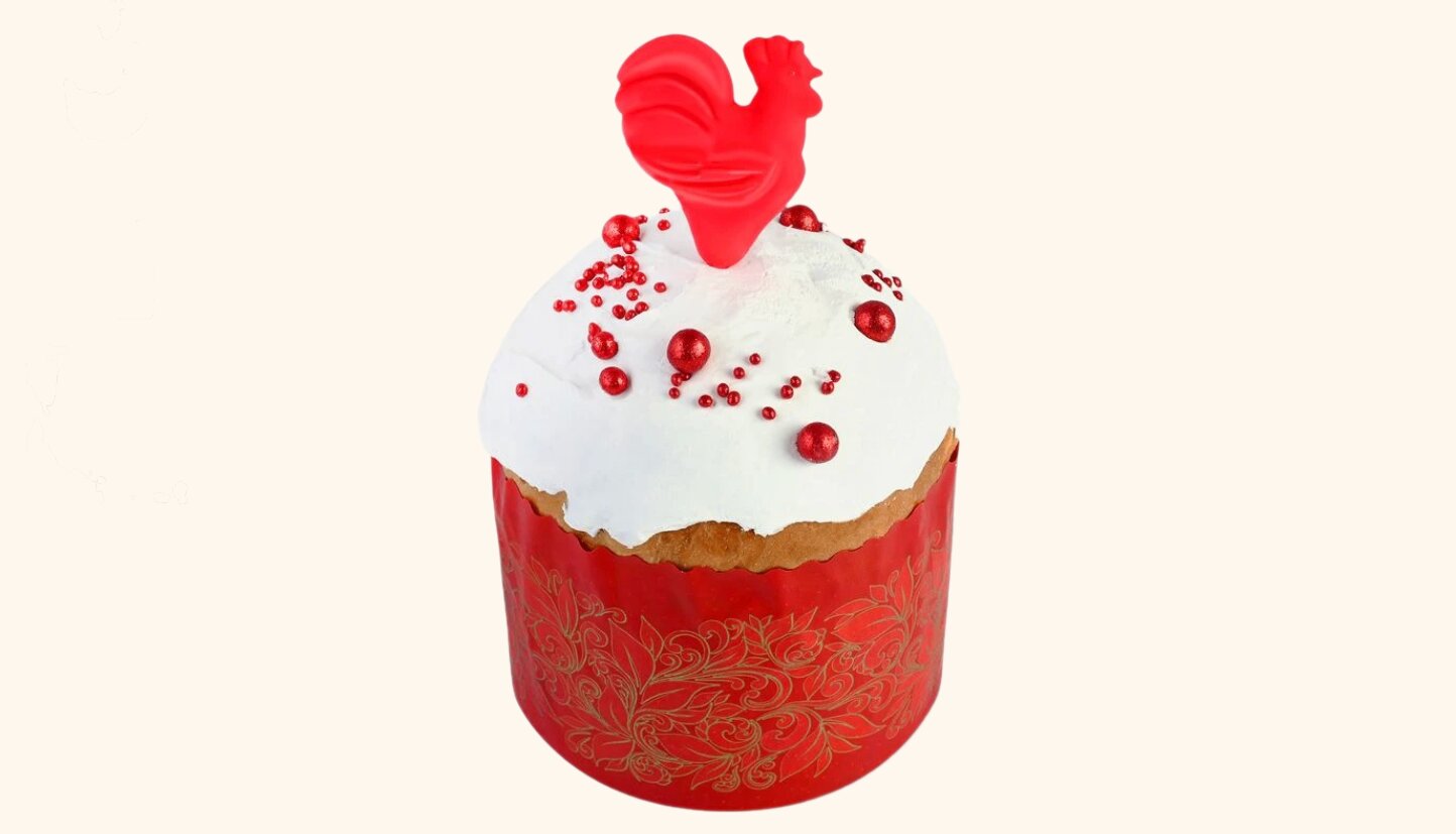 Пасхальный кулич, приготовленный на сливочном масле. Внутри изюм и сушёная клюква, снаружи — глазурь из белого шоколада. В качестве декора красные съедобные шарики и петушок на палочке. Масса — 590 грамм. Срок годности — 5 дней. Приобрести можно в магазинах сети «Перекрёсток».