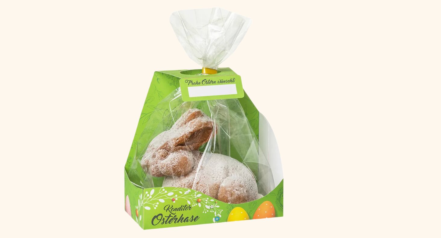Фигура кролика, выполненная из мягкого бисквита. Кекс выпекается по традиционному немецкому рецепту, обладает сладким вкусом с нотками ванили и плотной текстурой. Сверху он посыпан воздушной сахарной пудрой. Масса — 350 грамм. Срок годности — 126 суток. Приобрести можно в сети «Азбука вкуса».