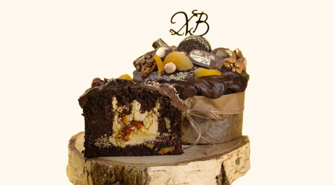 Кулич с шоколадным тестом и начинкой из карамели и заварного крема с варёной сгущёнкой. В комплекте идёт топпер. Сверху украшен орехами, курагой, печеньем и шоколадом. Масса — 500 грамм. Найти можно в кондитерской «Плюшки-подружки».