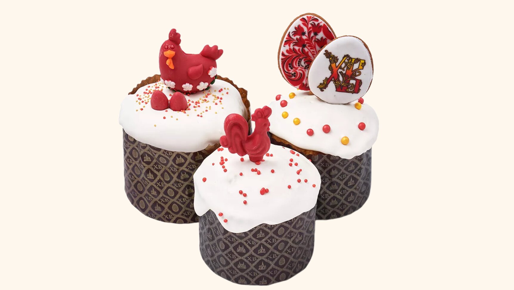 Набор состоит из трёх куличей, каждый из которых приготовлен на сдобном тесте на натуральных сливках. Внутри изюм, снаружи — сахарная помадка с уникальным украшением. Один кулич декорирован медовыми пряниками с праздничной символикой, а два других венчают петушок и курочка из глазури. Масса — 1395 грамм. Срок годности — 5 суток. Найти можно в сети магазинов «Азбука вкуса».