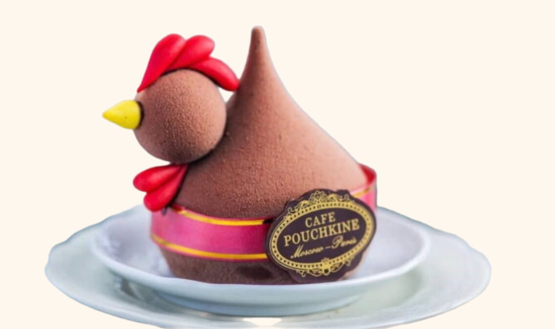 Десерт в виде курочки с шоколадными яйцами, которые наполнены миндальным, карамельным и вишнёвым гарниром. Масса — 210 грамм. Найти можно в кондитерской «Кафе Пушкинъ».