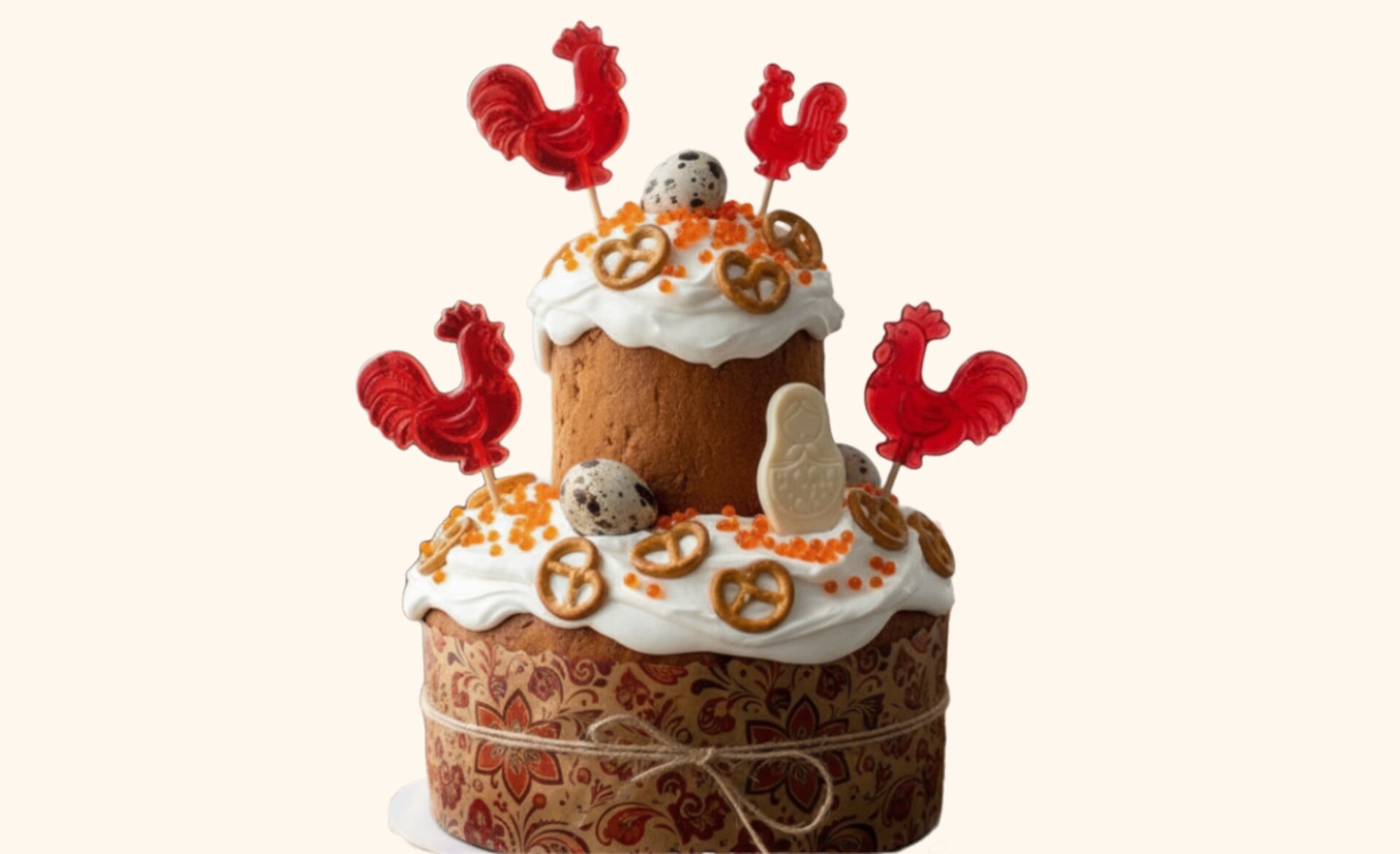Двухъярусный кулич в виде торта, который оформлен в русском народном стиле. В качестве декора тут выступают сладкие петушки, крендельки, белая шапка из крема, перепелиные яйца и красная икра. Всё это съедобно. Масса — от 5 кг. Заказать можно в кондитерской «На Большевике».