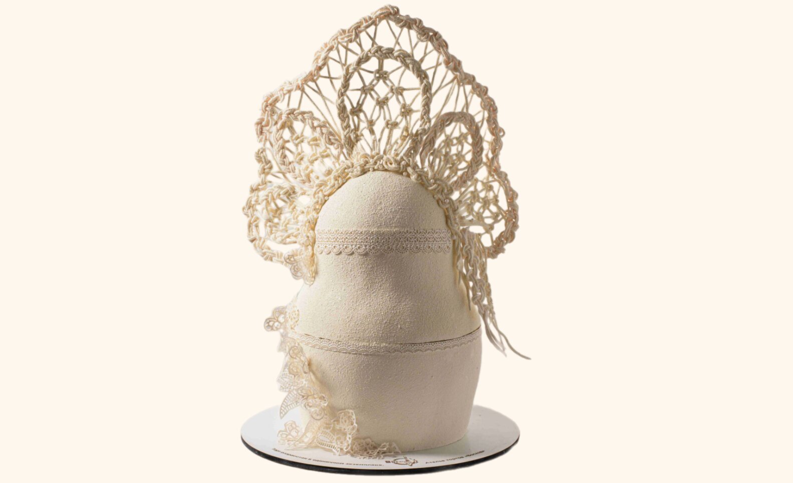 Сам кулич находится в шоколадной матрешке, украшенной кружевами и кокошником. Головной убор выполнен в технике макраме из съедобных нитей. Единственный несъедобный элемент — каркас кокошника. Внутри полуметровой матрешки скрывается «Царский» кулич, наполненный начинкой из шафрана и сладкий белой черешни. Кулич дополнен шоколадными яйцами. Заказать можно в ателье тортов «Восход».