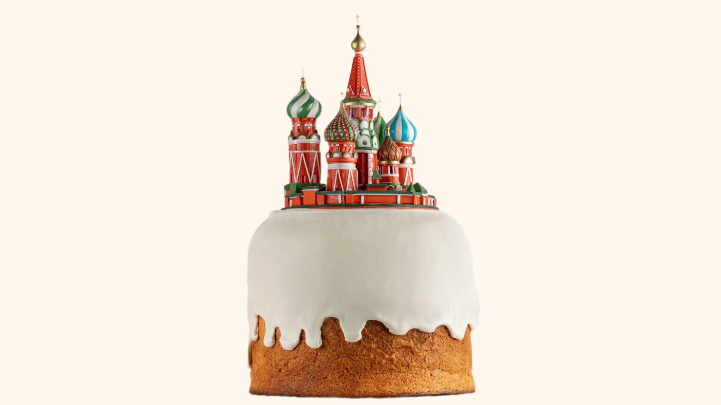 Авторский кулич с цедрой апельсина и фигуркой из сахарной мастики в виде Собора Василия Блаженного. Роспись и лепка сделаны вручную. Масса — 4 кг. Найти можно в кондитерской French Cake.