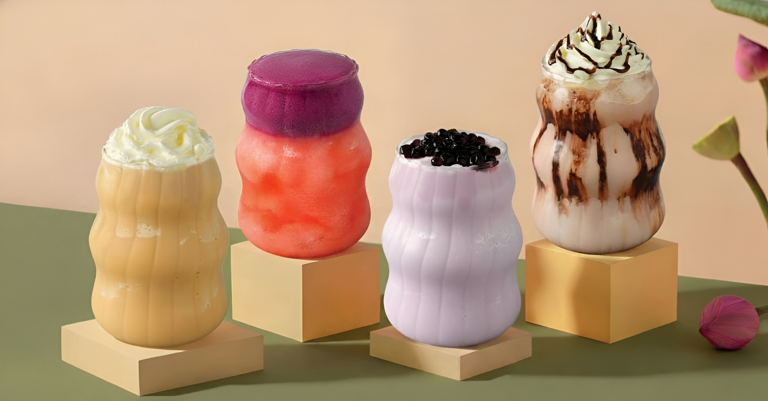 - Убе-смородина фраппе. Сливочный фраппе со вкусом убе и джем-боллами со смородиной.
