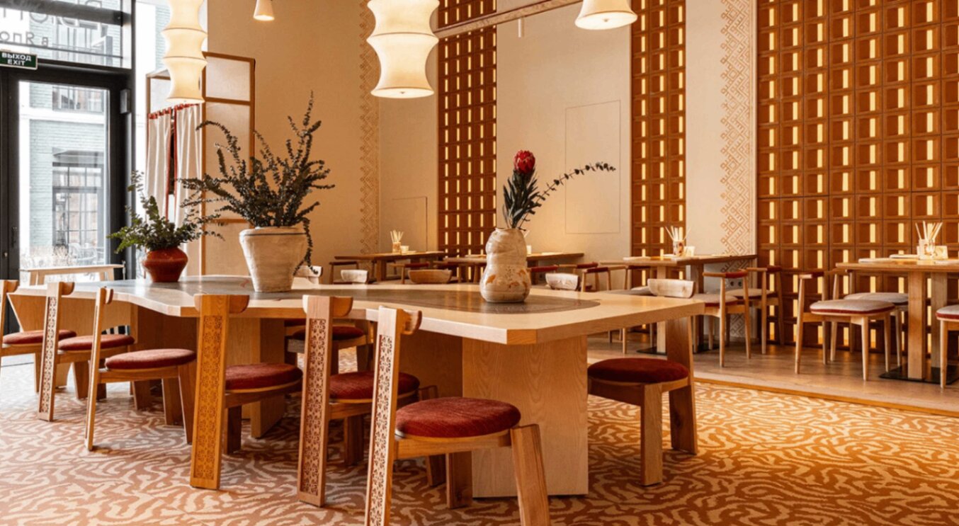 Интерьер кафе выполнен в светлых тонах с преобладанием эстетики «Страны восходящего солнца». Стены украшены изящными узорами, а на столиках установлены вазы с живыми растениями.