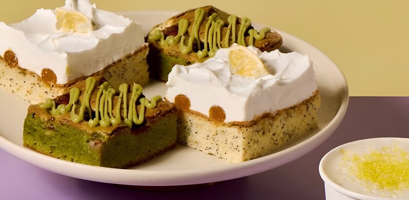 - Лимонно-маковый торт. Здесь сочетаются лимонный бисквит, мак, нежное ванильное безе и цитрусовая прослойка. Торт украшен долькой сушёного лимона.