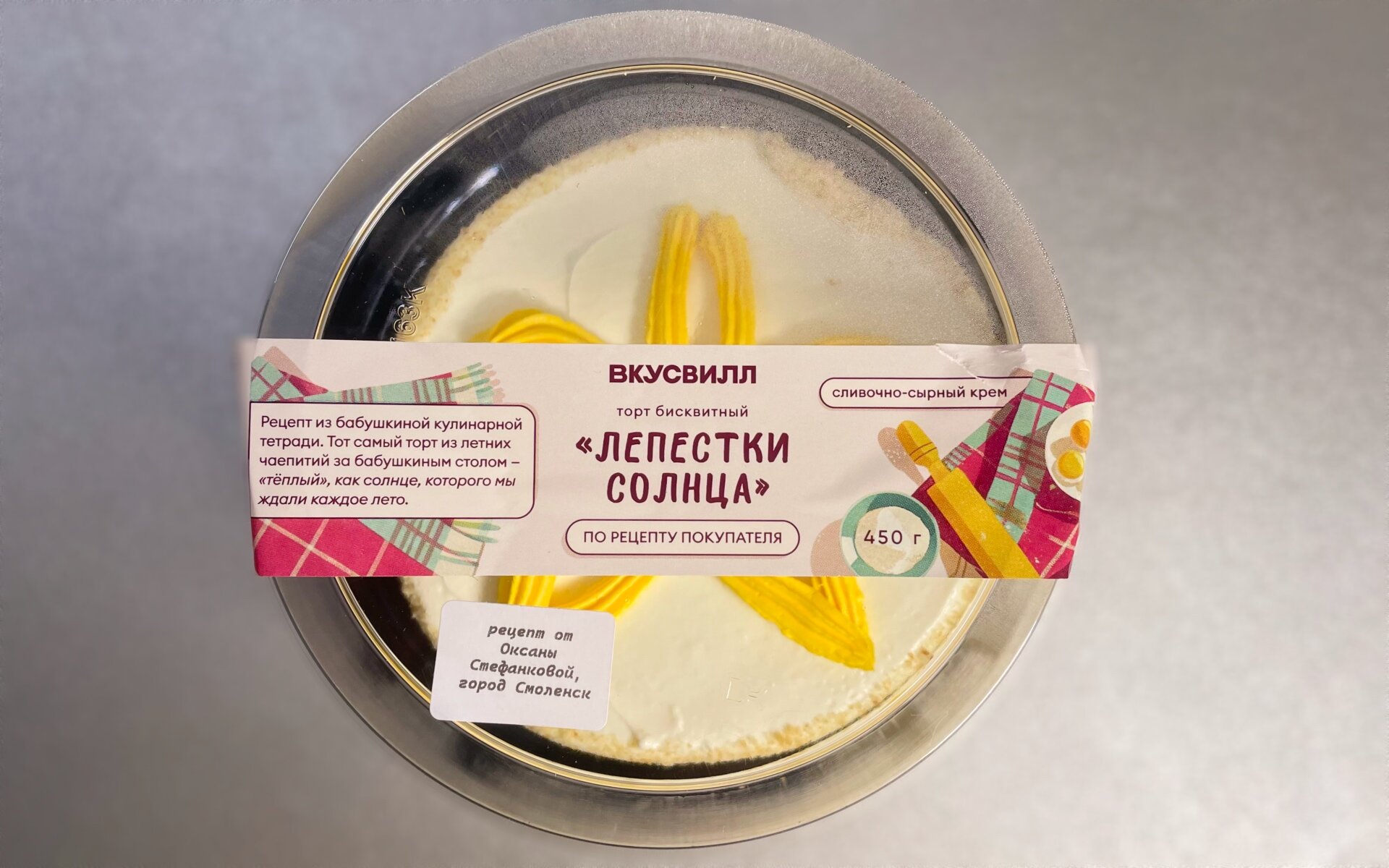 Возвращаясь вечером из спортзала, я по привычке зашёл во «ВкусВилл» за высокобелковым кефиром, чтобы добрать белок после тренировки. И тут же вспомнил о новой коллекции тортов по рецептам покупателей и решил, что можно себя побаловать. Взял на пробу тот, которому в пресс-релизе уделили больше всего внимания, — «Лепестки солнца».