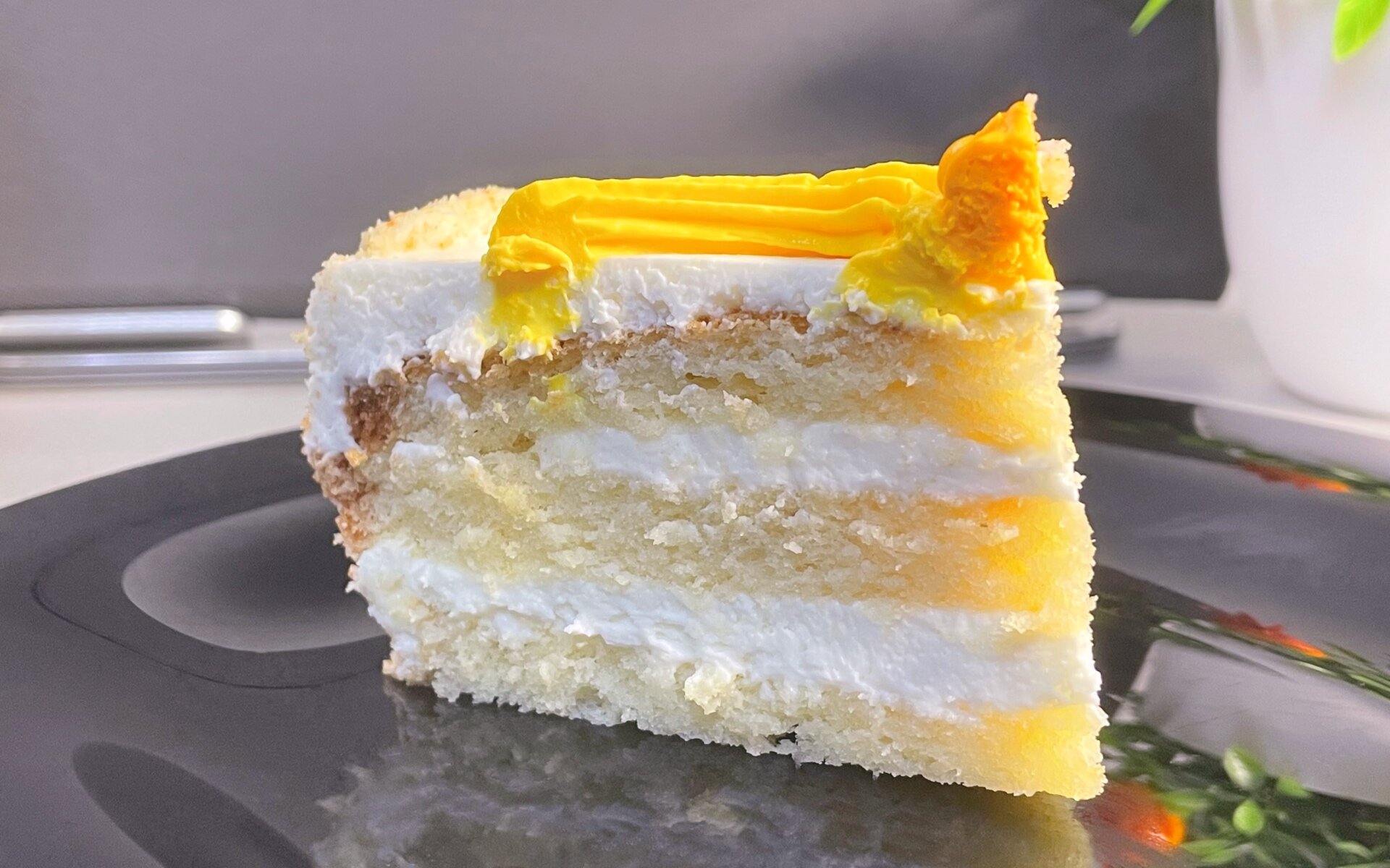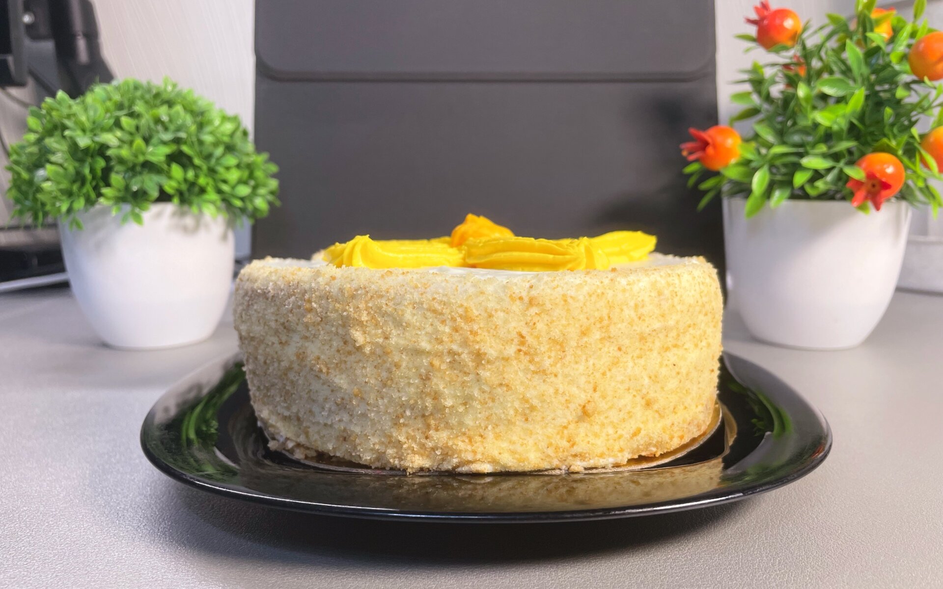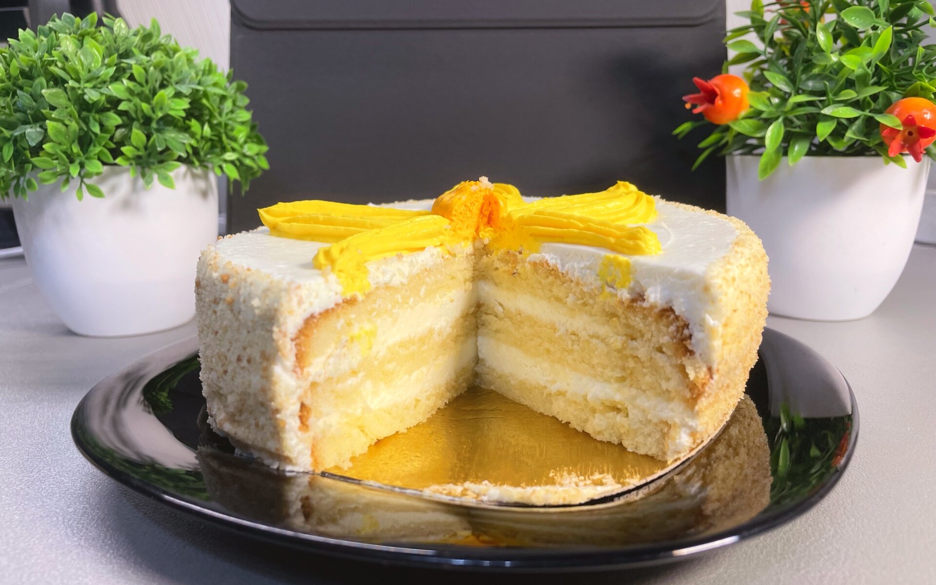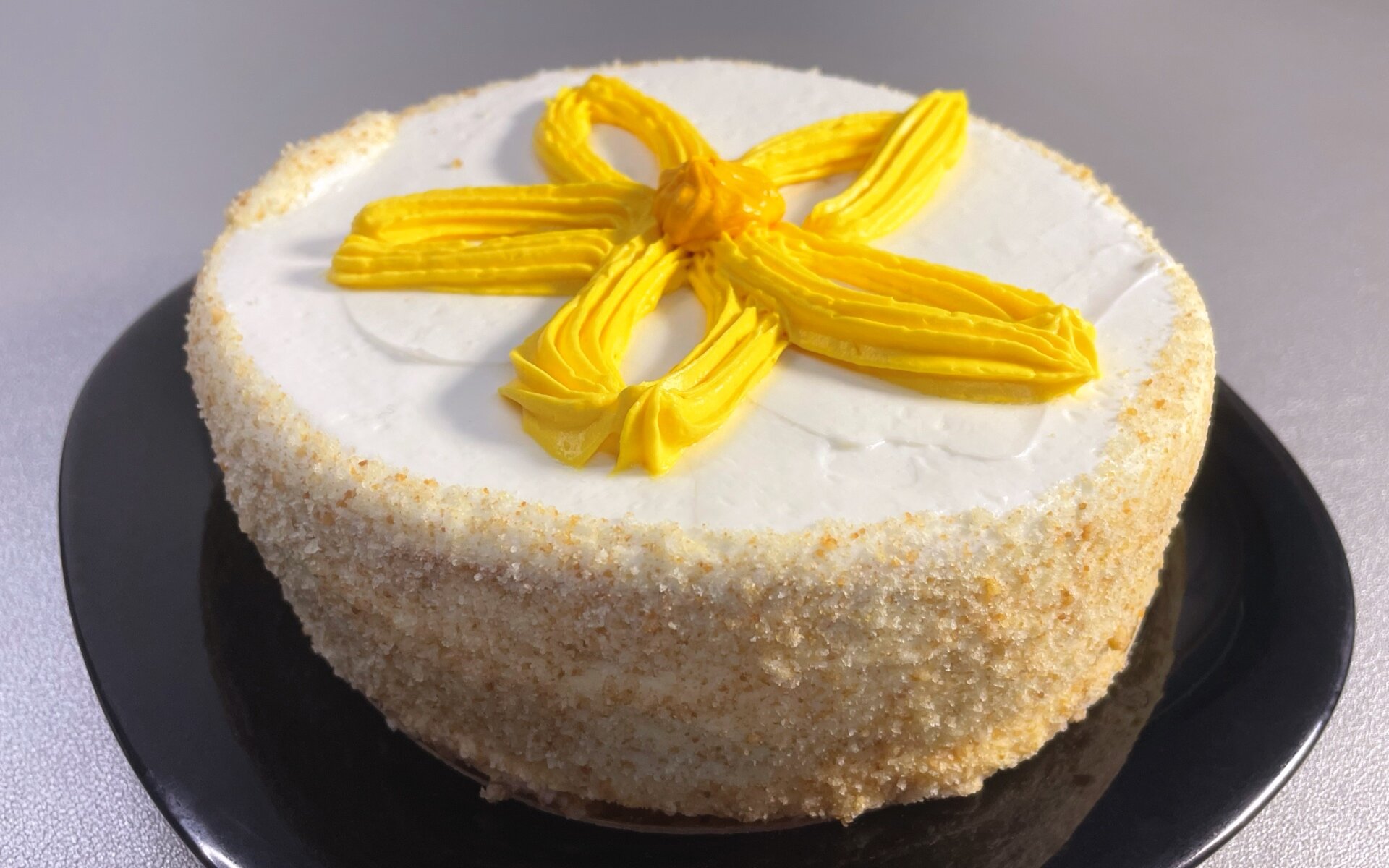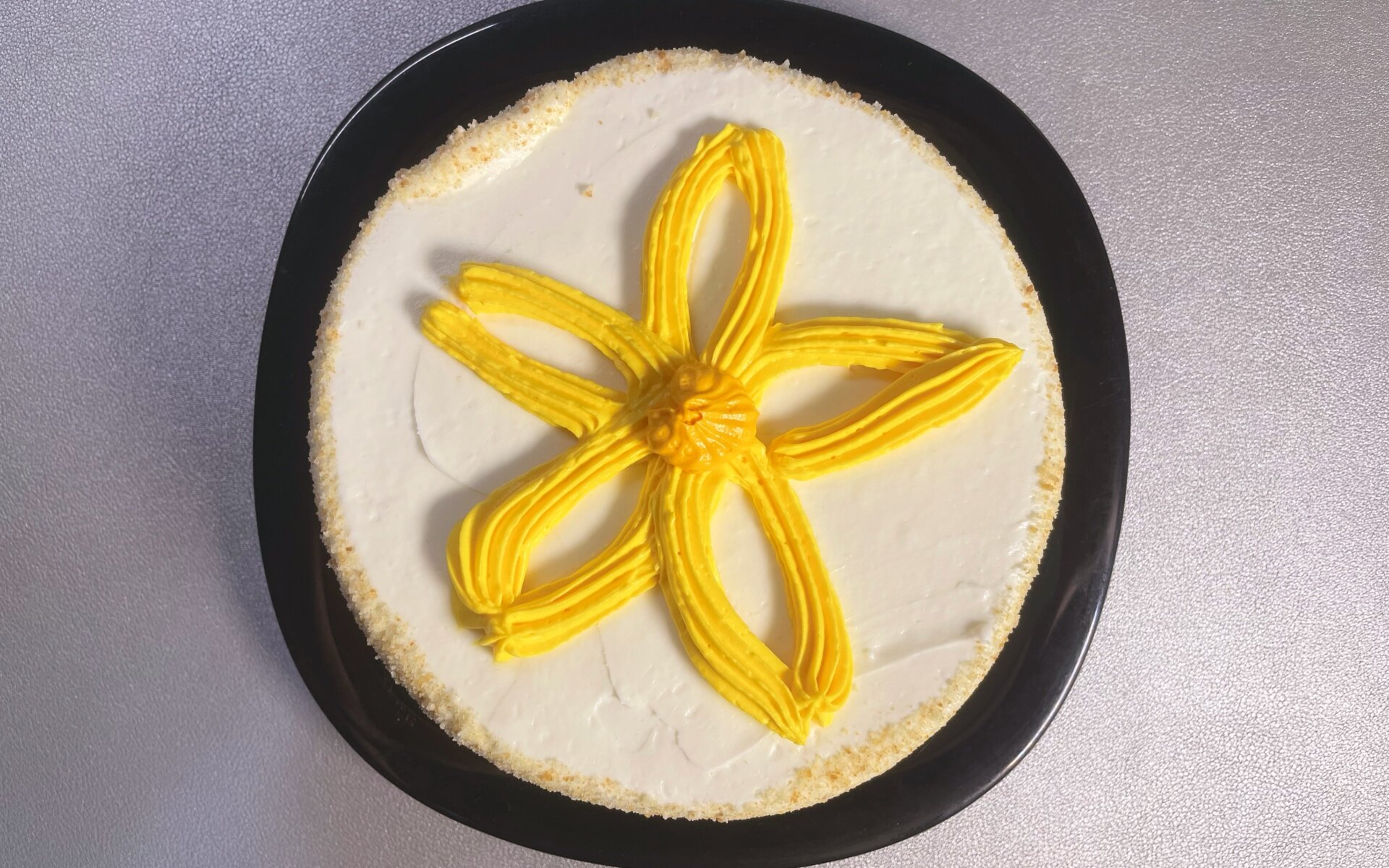 Десерт выглядит под стать весне — с её долгожданным солнцем и белыми облаками, которые наконец-то не предвещают новых сугробов: белый торт с ярким жёлтым цветком сверху и бисквитной крошкой по бокам. Лаконично — и мне это нравится.