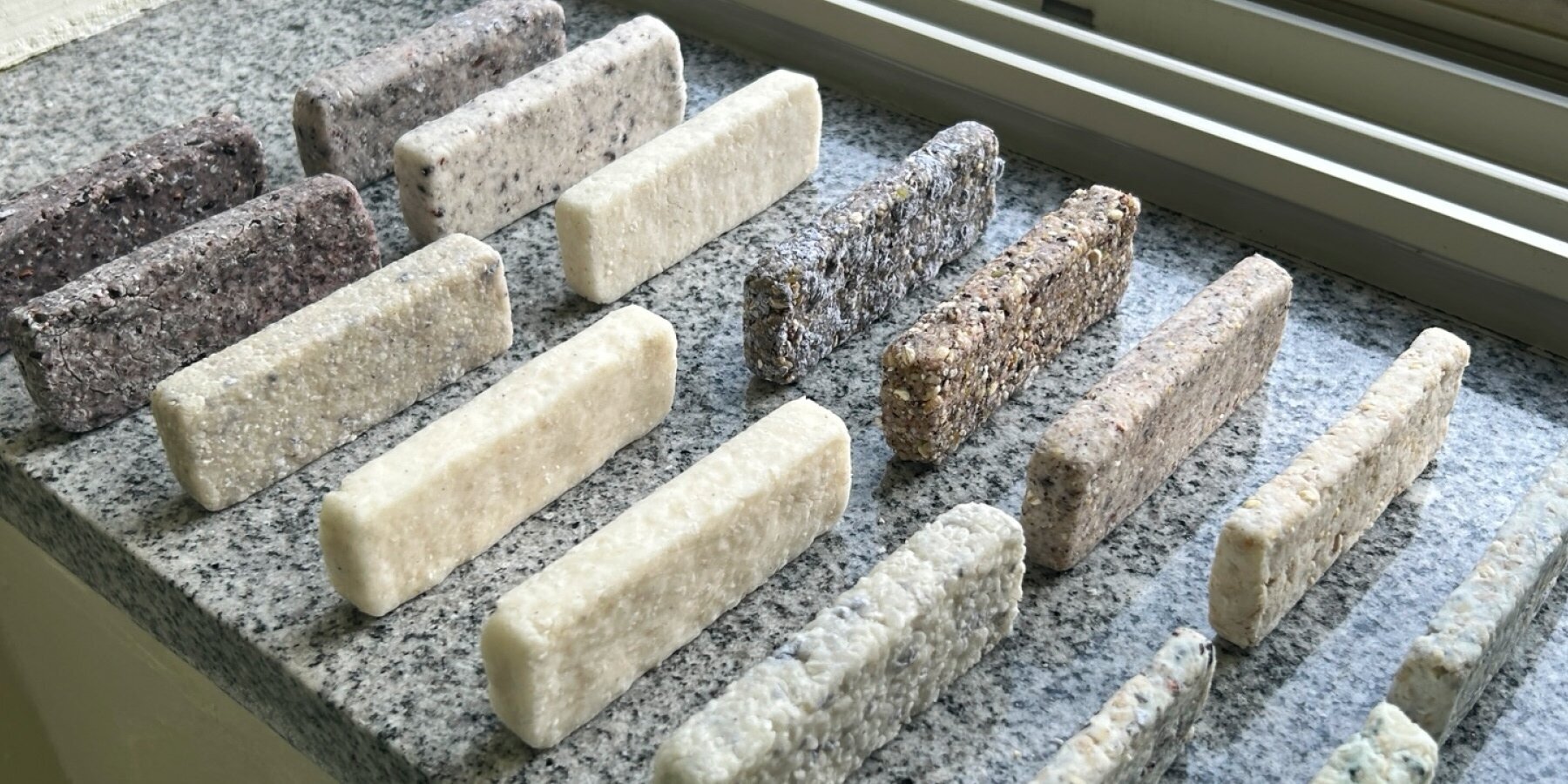 Молотый рис приобрел мягкий кремовый оттенок с легкой полупрозрачностью, что особенно заметно в образцах, изготовленных из тонкой муки. В более крупных образцах подчеркивалась структура зерен, что приводило к более выраженной текстуре и вариациям поверхности. Использование натуральных материалов также предполагает их биоразлагаемость, помещая материал в временные рамки, отличные от рамок обычных строительных материалов.