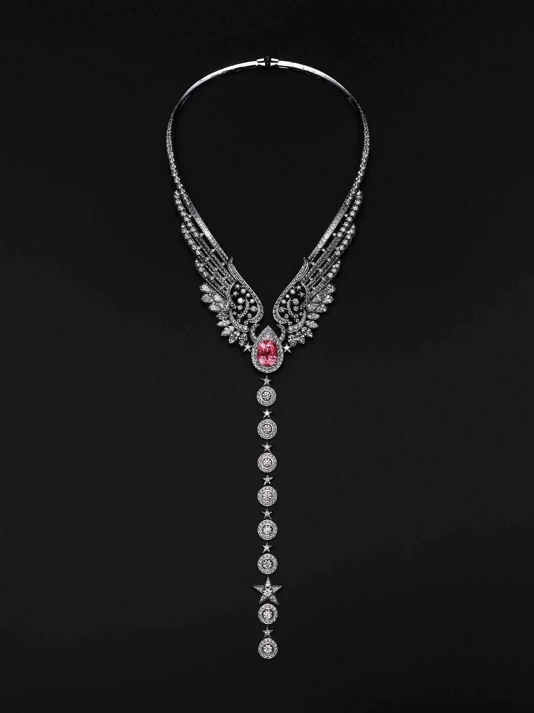 Главным украшением считаются крылья, вдохновленные фразой Габриэль Шанель об амбициях. Она утверждала, что если человек родился без крыльев, он не должен мешать им вырасти. В центре ювелирного изделия разместили сапфир падпараджа весом 19,55 карата, а общий вид дополнили рядами бриллиантовых капель в виде крыльев.